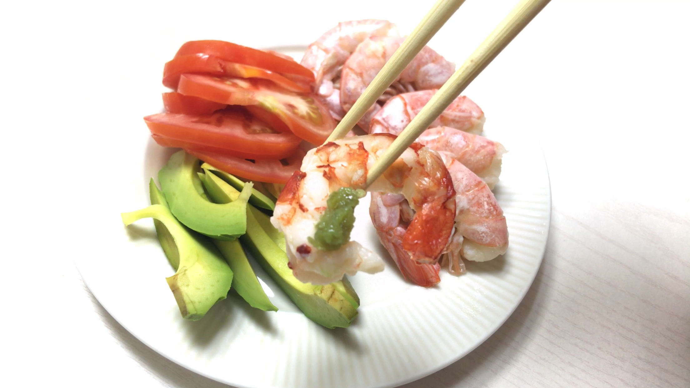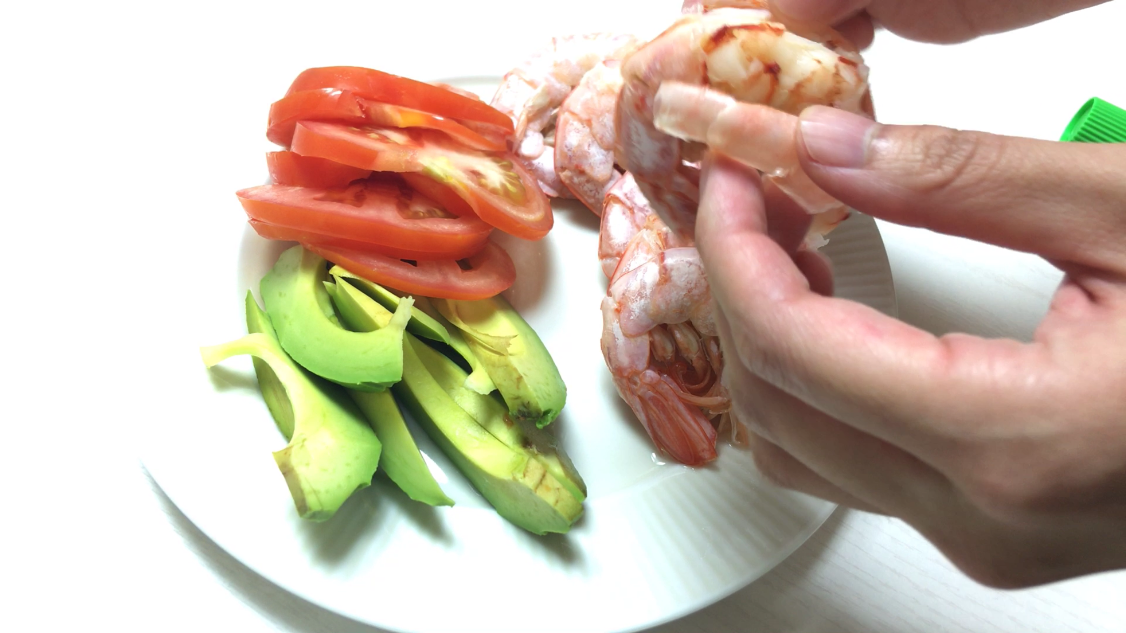 맛있게 잘 데쳐진 새우를 가지런히 담고, 토마토와 아보카도를 세팅했어요. 이렇게 새우와 아보카도가 곁들여지면 포만감도 들고 건강한 맛이 나죠^^