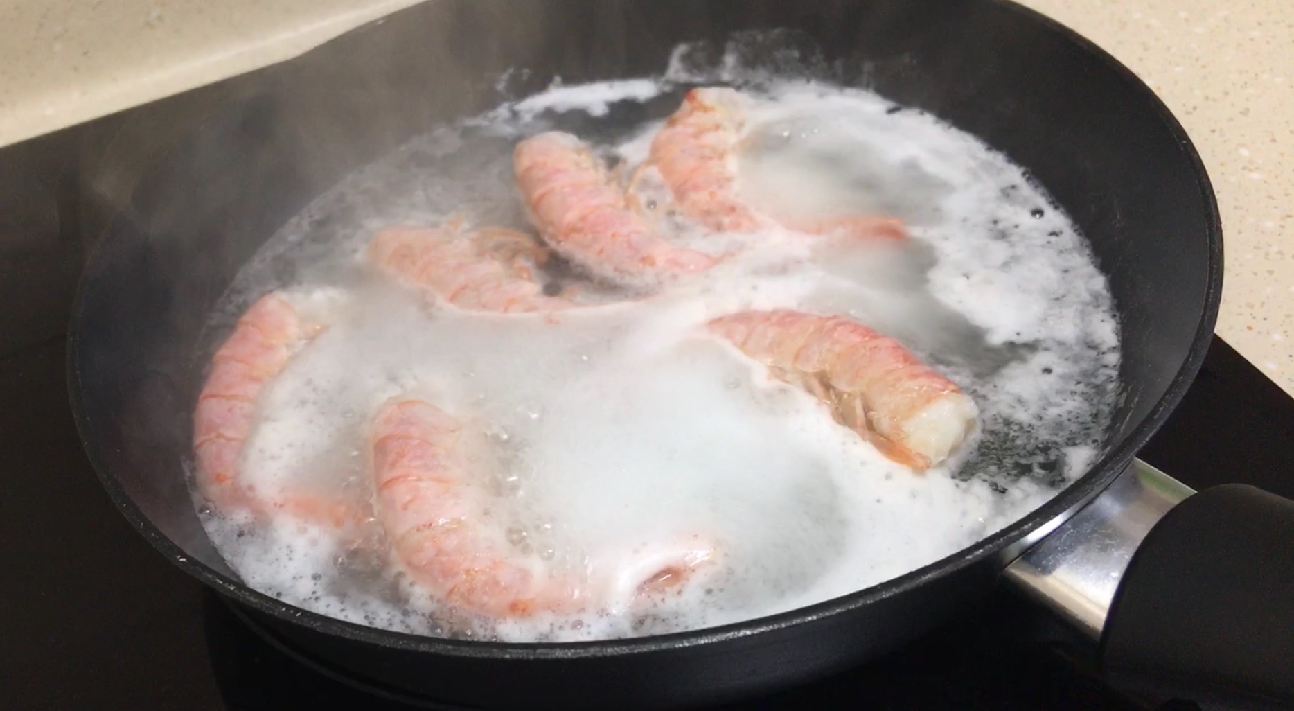 프라이팬에 물을 조금 붓고 신속하게 데쳐줬어요~ 끓는 물에 5분정도 데치면 딱 좋아요^^ 이거 데치는 동안 맛있는 바다 냄새가 나서 이 국물에 그대로 라면끓여먹고싶었지만, 아보카도와 토마토를 썰면서 꾹 참았어요 ㅠㅜ